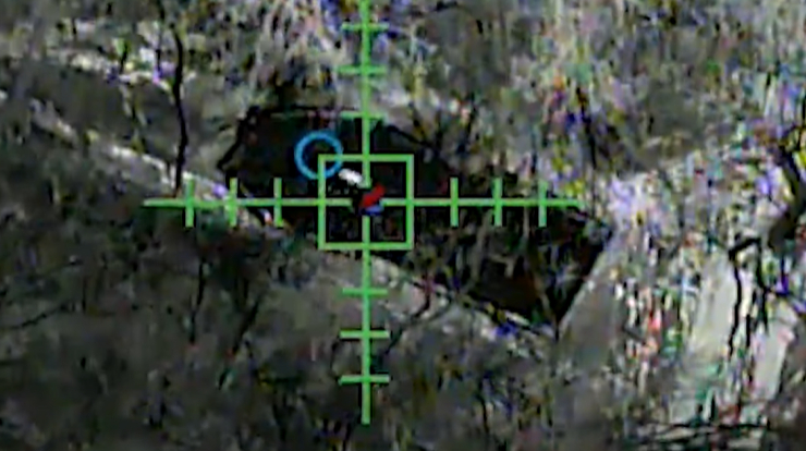 На відео показана повітряна розвідка та прицільні удари безпілотників по ворожій техніці, прихованій серед лісосмуг та в тилу. На кадрах видно наведення через приціл безпілотника та вибухи після попадань.